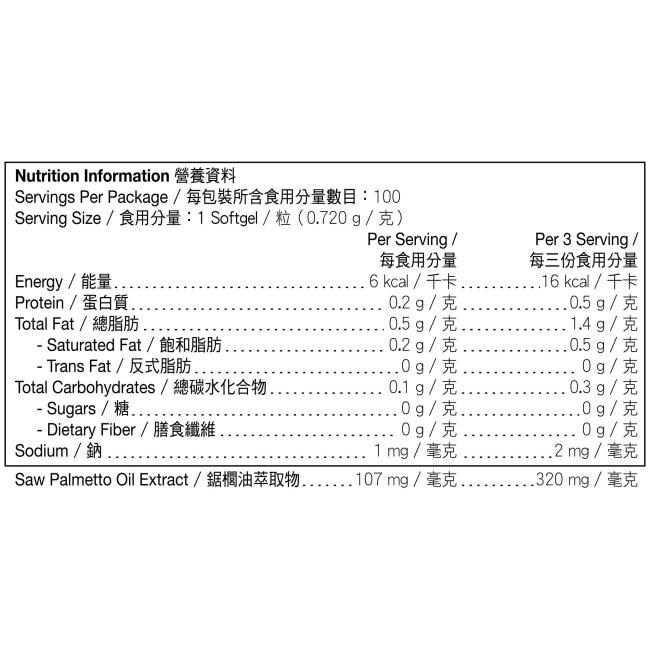 • 每三粒含320毫克鋸櫚果精華,含豐富脂肪酸,為男士前列腺健康提供豐富的營養。