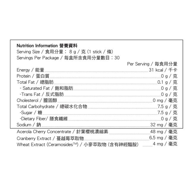 果糖、檸檬酸、天然西柚香料、鹽、針葉櫻桃濃縮素、麥芽糊精、中鏈三酸甘油脂、紅菜頭汁、蔓越莓萃取物、小麥萃取物(含有神經醯胺)、抗氧化劑(抗壞血酸)