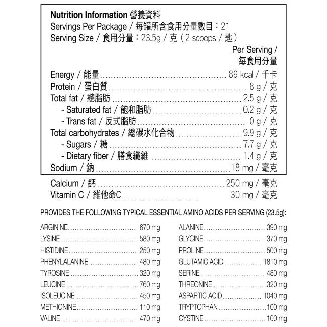 鈣-250毫克、維他命C-30毫克、蛋白質-8克、精胺酸- 670毫克、離胺酸- 580毫克、組胺酸- 250毫克、苯丙胺酸- 480毫克、酪胺酸- 320毫克、白胺酸-760毫克、異白胺酸-450毫克、甲硫胺酸-110毫克、半胱胺酸-100毫克、纈胺酸- 470毫克、丙胺酸- 390毫克、甘胺酸- 370毫克、脯胺酸- 500毫克、 穀胺酸-1810毫克、絲胺酸- 480毫克、酥胺酸- 320毫克、天冬胺酸- 1040毫克、色胺酸- 100毫克